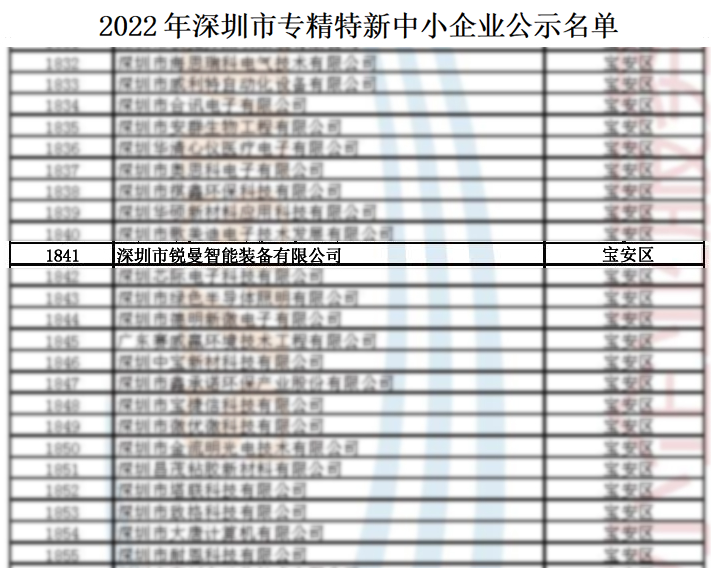 3月15日,深圳中小(xiǎo)企業服務局公布2022年深圳市“專精特新”企業名單,經過層層篩選和(hé)專家(jiā)評審,銳曼機器(qì)人(rén)憑借專業的核心業務、精細管理(lǐ)、突出的創新技(jì)術(shù)及研發能力,在衆多(duō)中小(xiǎo)企業中脫穎而出,順利成為(wèi)“專精特新”企業的一員。